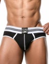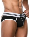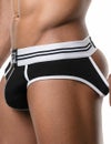 スポーティーなデザインにオープンバック&伸縮性抜群の脚ゴムをプラス。